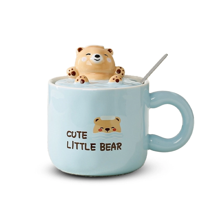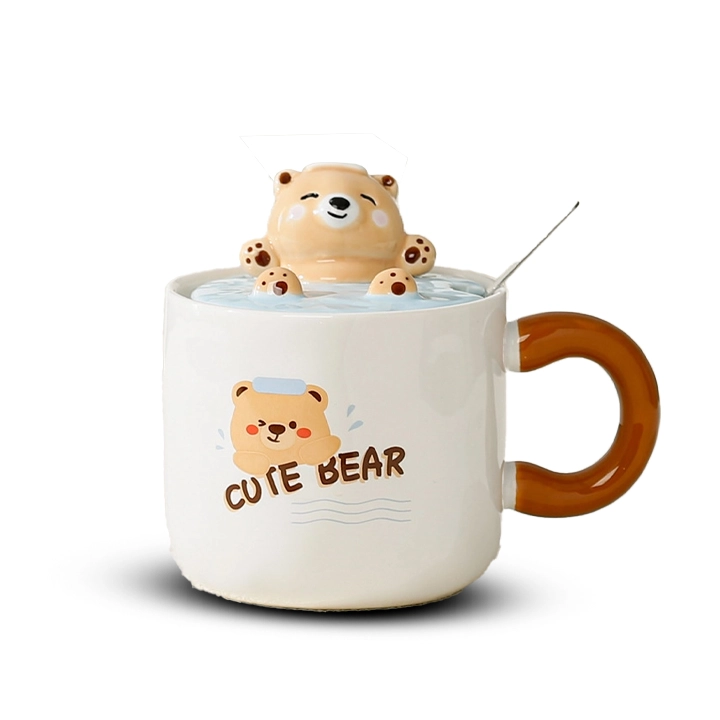 ماگ درب‌دار خرسی طرح شنا | لیوان فانتزی سرامیکی با طراحی خاص و درب محافظ